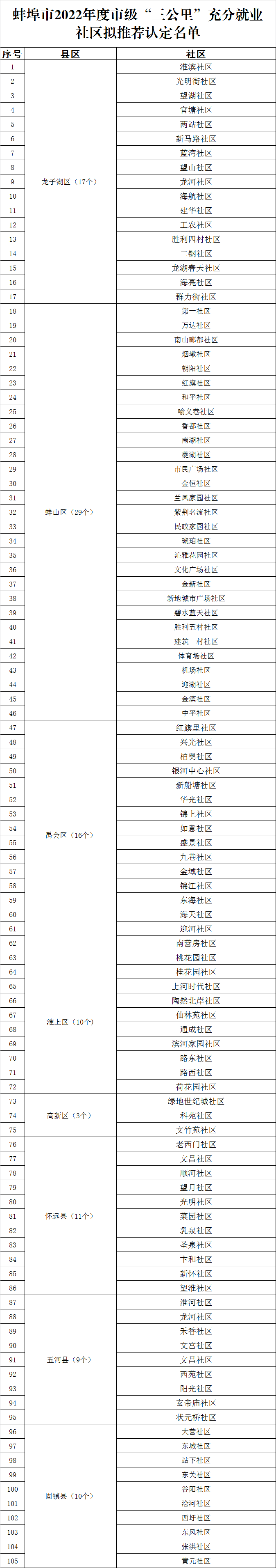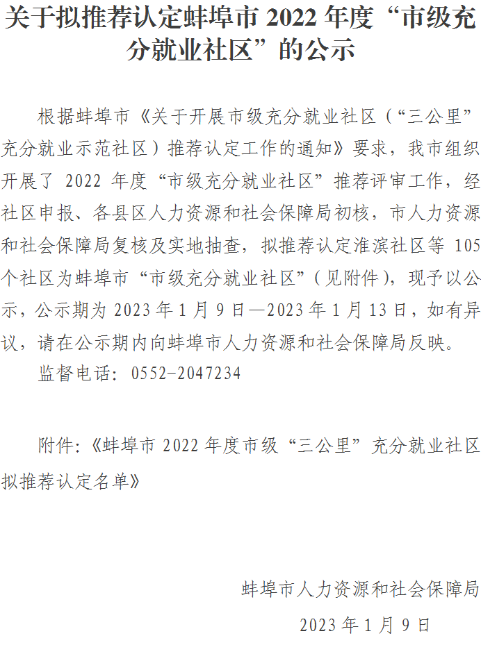 关于拟推荐认定蚌埠市2022年度“市级充分就业社区”的公示