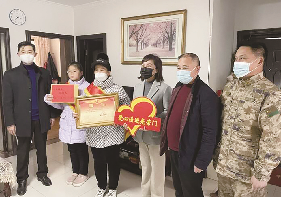 近日,胜利街道党工委、人武部走访慰问华景嘉园小区现役军人张海洋家庭,为其送去荣立“三等功”的喜报和慰问金。通讯员 孙平 摄