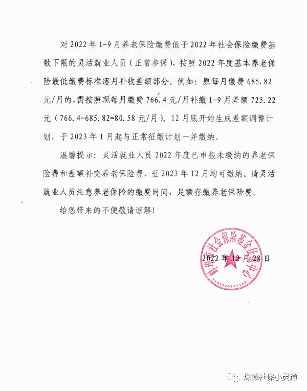 根据2022年12月28日蚌埠市社会保险基金征缴中心《关于灵活就业人员2022年度养老保险费差额补收的相关通知》要求,需“对2022年1-9月养老保险缴费低于2022年社会保险缴费基数下限的灵活就业人员(正常参保),按照2022年度基本养老保险最低缴费标准逐月补收差额部分”。对养老保险相关政策及扣款金额如有疑问,欢迎来电咨询,税务部门将积极答复。真诚感谢大家对税务工作的关心和支持,欢迎对税务部门的工作提出意见和建议。给您带来的不便,敬请谅解。联系电话:2080511,3099252。