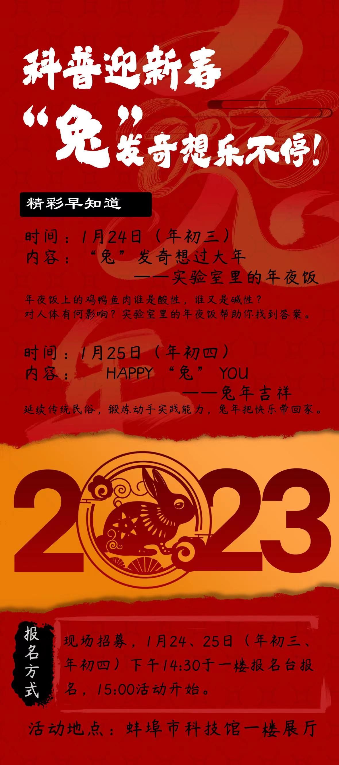 蚌埠市科技馆春节期间1月24日(初三)——1月27日(初六)正常开放,并将结合“我们的节日·‘春节’”开展“科普迎新春‘兔’发奇想乐不停”科普主题活动,让市民朋友在与亲友团聚的同时,还可以一起来到蚌埠科技馆里过大年。