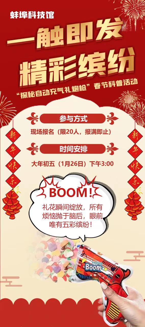 《荆楚岁时记》载“正月一日,鸡鸣而起,先于庭前爆竹”,可知用“噼里啪啦”的响声辞旧迎新的习俗由来已久,在烟花爆竹禁燃的如今,1月26日(年初五)来科技馆学习“自动充气礼炮枪”的制作,了解自动充气的原理,讨论礼花枪里的物质,通过探究性学习模式及小组的合作活动,与小伙伴们一起利用科学辞旧迎新吧。