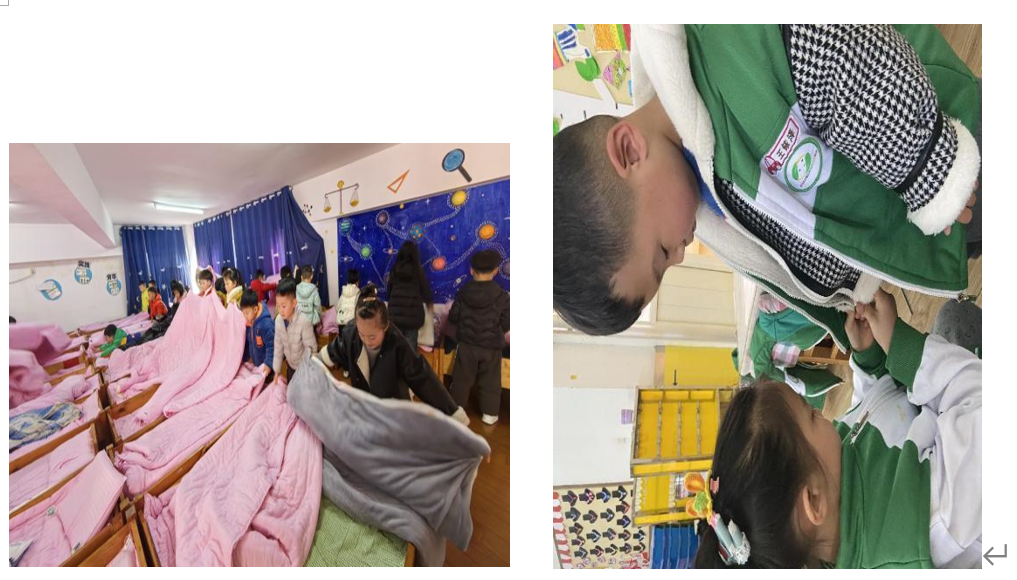 大班小朋友开展了整理床铺、帮助弟弟妹妹穿衣服活动。