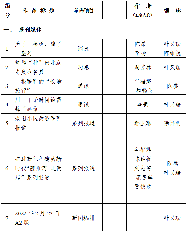 蚌埠日报社2022年度安徽新闻奖拟推荐作品目录