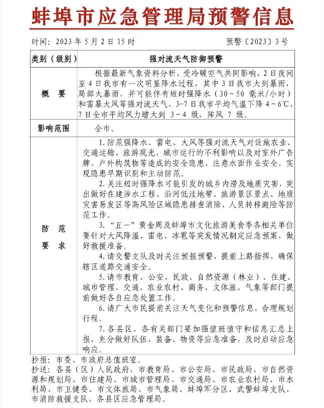 蚌埠发布客户端讯 5月2日15时,市应急管理局发布强对流天气防御提醒,提醒各县区、各相关部门注意防范应对。