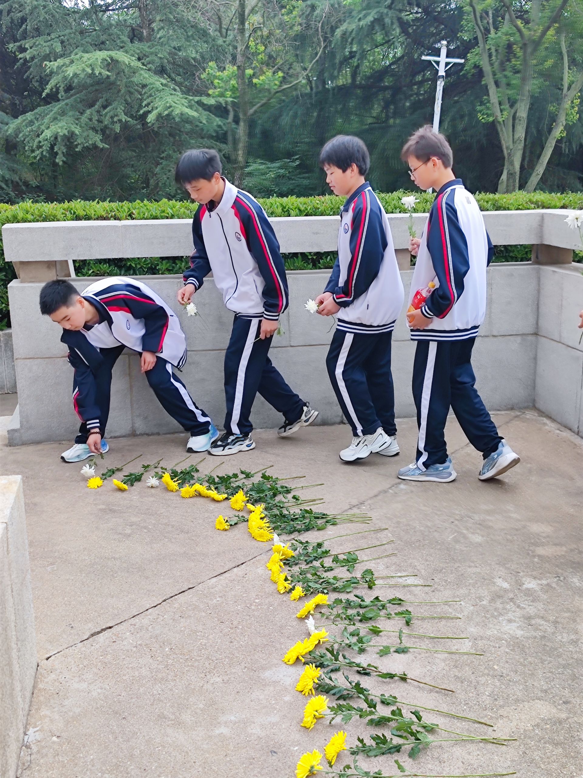 在巍峨的革命烈士纪念碑下师生们全体肃立,奏唱国歌;怀着无比崇敬的心情向烈士默哀;三鞠躬;敬献鲜花瞻仰烈士纪念碑。