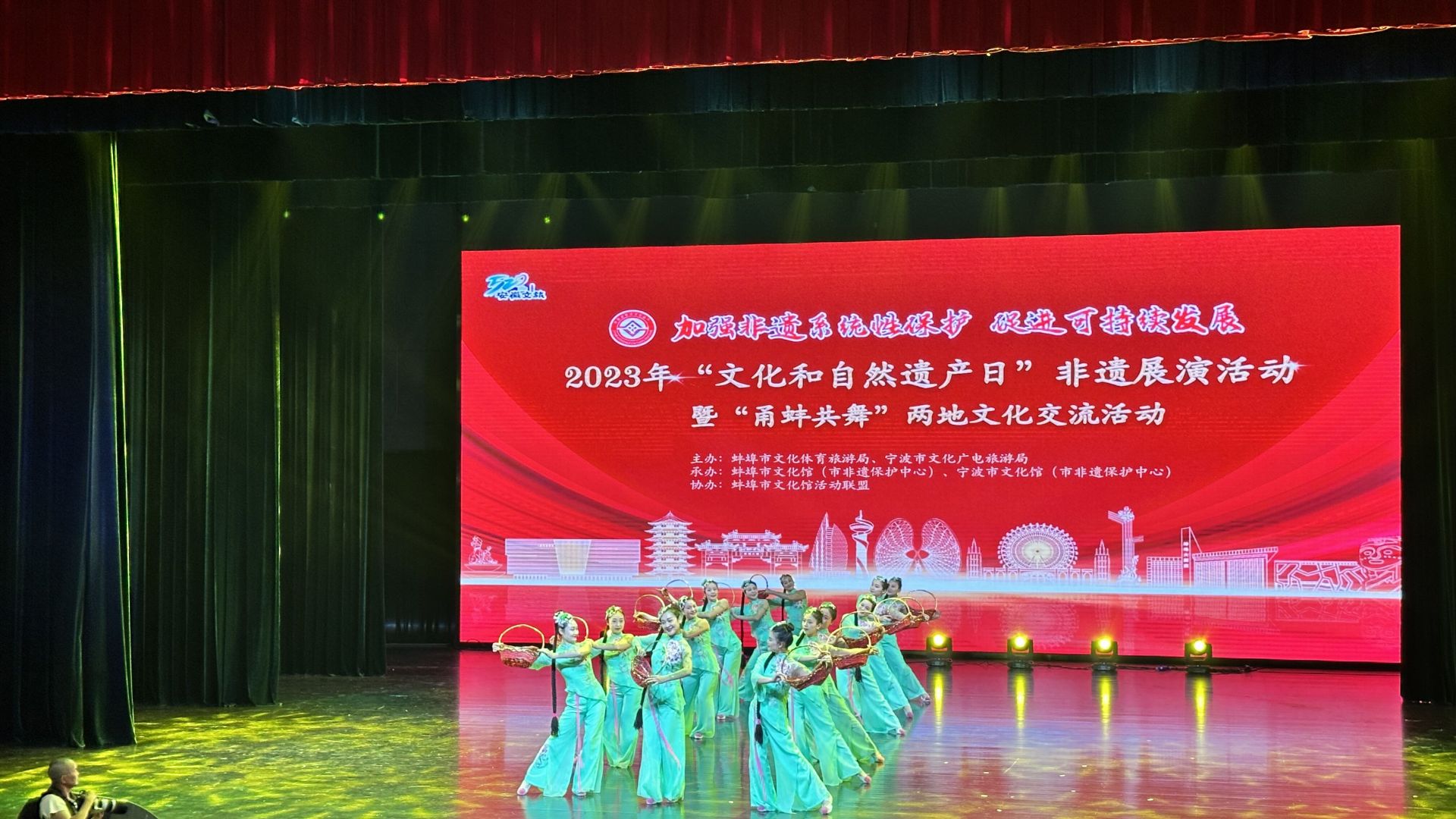 上午10点,2023年“文化和自然遗产日”非遗展演活动在蚌埠文化剧场举办。来自蚌埠、宁波两地的非物质文化遗产传承人粉墨登场迎盛世,薪火相传展风采。此次展演遴选了蚌埠市优秀非遗节目7个,邀请宁波市优秀非遗节目3个来蚌交流展演。通过甬蚌两地非遗节目同台竞演向广大群众展现传统非遗无穷魅力,推深甬蚌两地文化交流合作。蚌埠日报微信公众号进行全程直播。