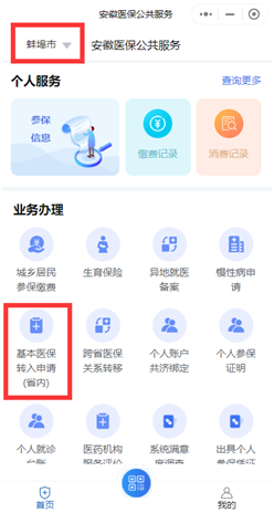 2. 转入地正常参保后可注册登录微信小程序“安徽医保公共服务”-选择地市“蚌埠市”-业务办理-基本医保转入申请(省内),按要求填写必要信息。
