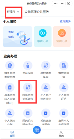 2.转入地正常参保后可注册登录微信小程序“安徽医保公共服务”-选择地市“蚌埠市”-业务办理-跨省医保转移,根据办理事项选择“跨省转移接续转出地申请、跨省转移接续转入地申请”,按要求填写必要信息。