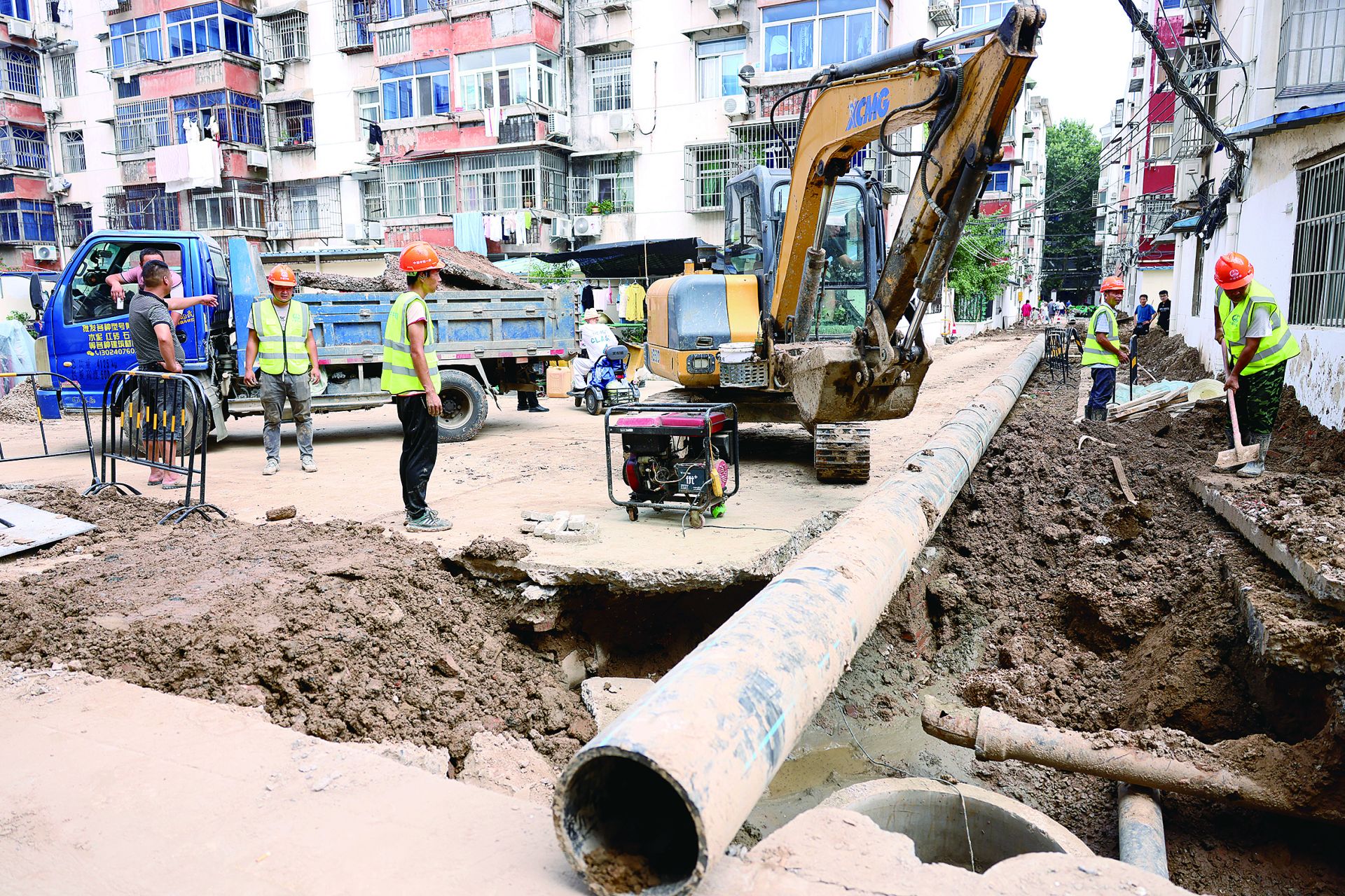 地质西院小区,施工单位正在进行雨污管道铺设作业。