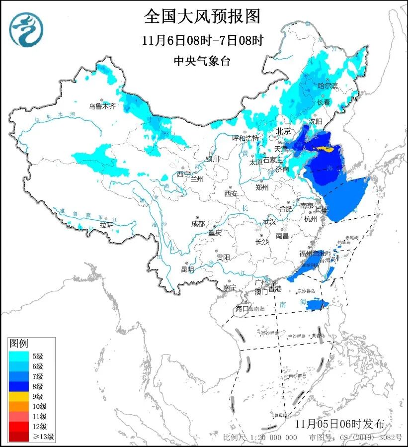预计,11月5日08时至6日08时,新疆中北部、内蒙古中南部和东南部、青海东部、甘肃中部、宁夏、陕西北部、山西、河北中西部、北京、天津东部、河南北部、山东东部、辽宁西部、吉林西部、黑龙江南部、湖北东南部、湖南北部、江西北部等地将有5~6级、阵风7~9级的大风;渤海、渤海海峡、黄海大部海域、东海北部海域将有7~8级、阵风9级的大风,其中渤海海峡、黄海北部和中部的部分海域风力可达9级,阵风10~11级。