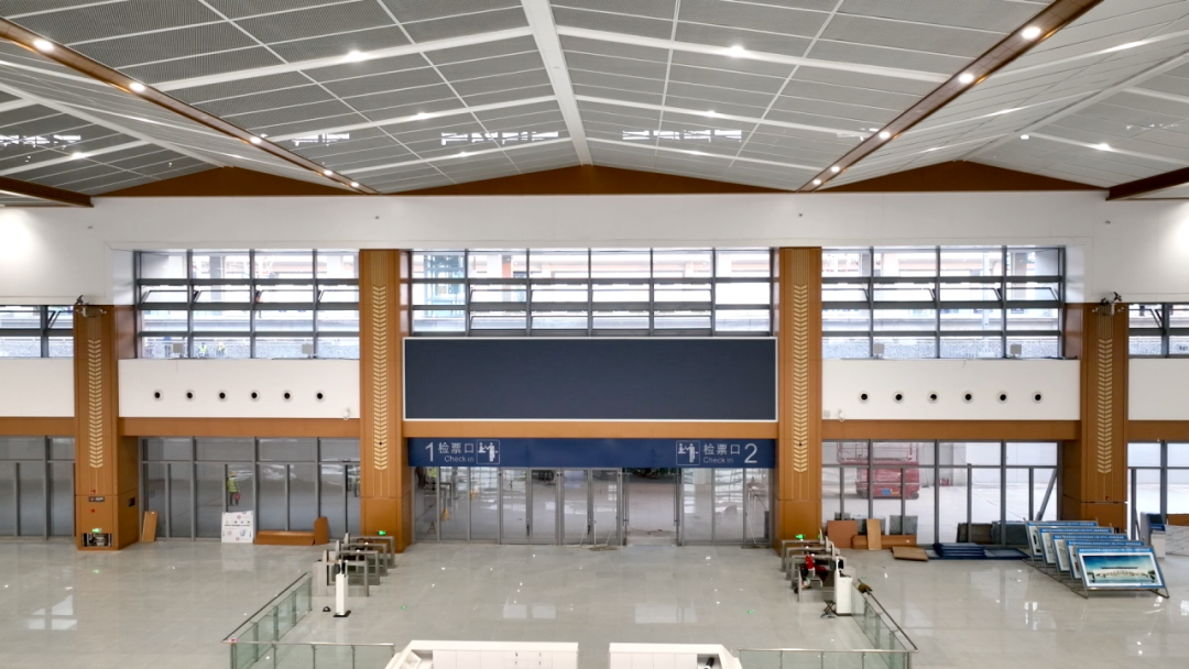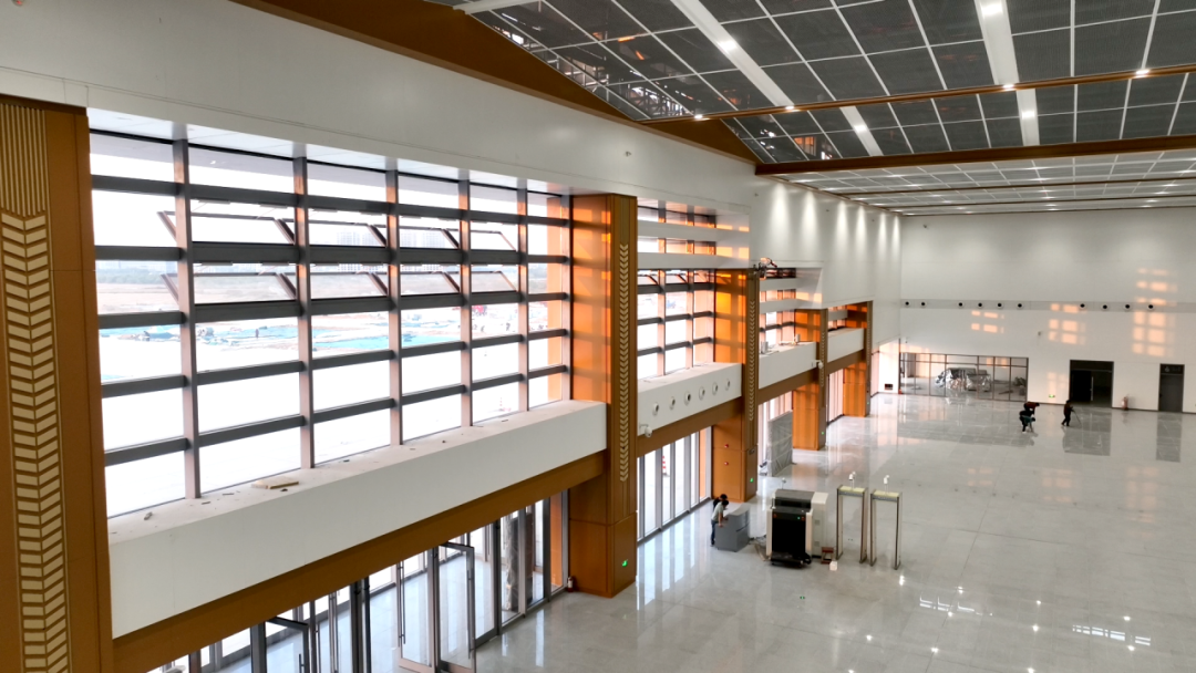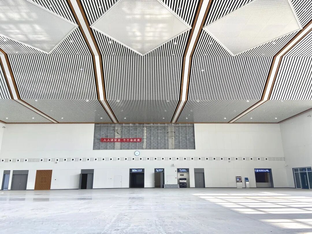 站房设计以“红色莘县,高塔燕来”为主题,整体采用浅灰色调,局部点缀仿木色,在营造现代交通空间的同时增加人文气息。