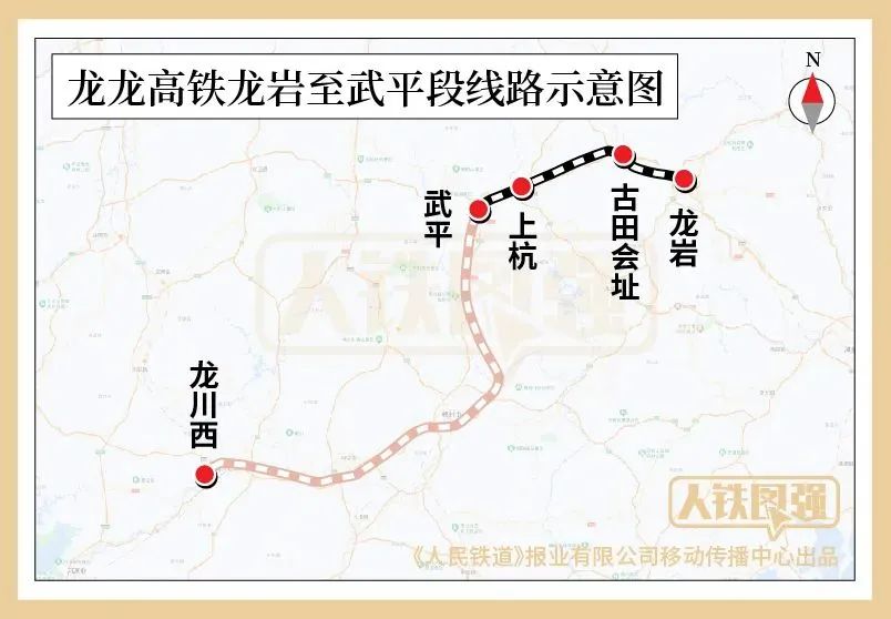 龙龙高铁起自福建省龙岩市龙岩站,终至广东省河源市龙川西站,线路全长290公里,按龙岩至武平、武平至梅州、梅州至龙川西三段建设。此次开通的龙岩至武平段,线路全长92公里,新建线路64公里,设计时速250公里,设龙岩、古田会址、上杭、武平4座车站,其中上杭站、武平站为新建车站,古田会址站为改扩建车站。