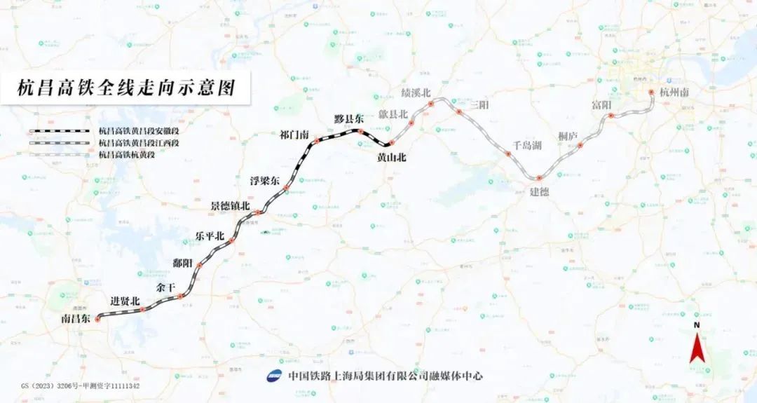 杭昌高铁起自杭州南站,途经浙江省杭州市,安徽省宣城市、黄山市,江西省景德镇市、上饶市、南昌市,接入南昌东站,线路全长560公里,其中杭昌高铁杭黄段已于2018年12月25日开通运营。