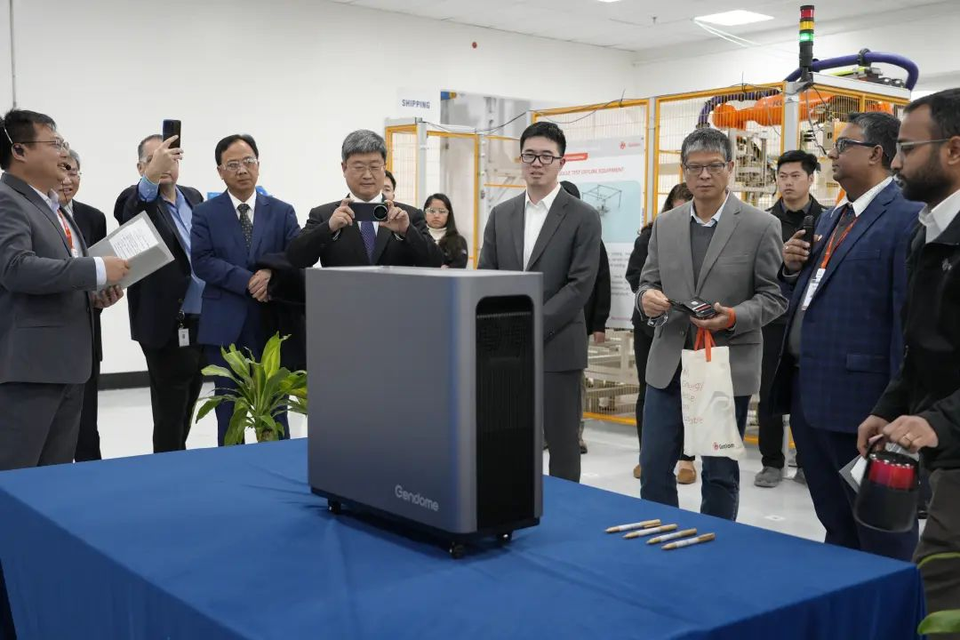 安徽省副省长孙勇(右四)、美国加州众议员 Alex Lee(右一)、弗里蒙特市市长Lily Mei(右二)、中国驻旧金山总领馆经商参赞邬沛民(左四)、国轩高科高级副总裁李晨(右三)等现场见证