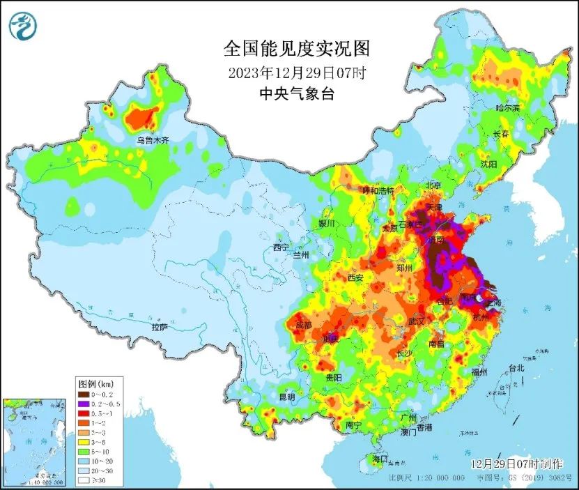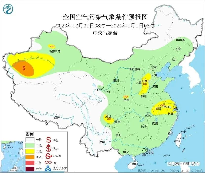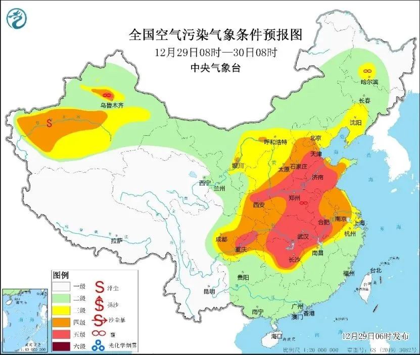 29日早晨,中央气象台将大雾预警升级为最高等级的红色,这也是今年首次发布大雾红色预警。气象监测显示,今晨,内蒙古中部、宁夏北部、陕西、山西、河北中南部、天津、山东、河南、苏皖中南部、浙江北部和西部、江西北部、湖北、湖南及四川盆地等地出现轻度到中度污染,部分地区重度污染;上述部分地区出现能见度不足1千米的大雾,其中河北、山东、安徽、江苏、浙江及上海等局地能见度不足200米。今天早晨至上午时段,四川盆地至黄淮、江淮一带的大雾天气仍会持续。