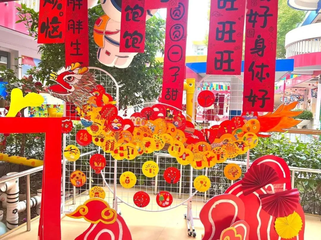 为了这场有爱的相约,老师们精心准备,让幼儿园里“年味儿”十足,大厅、班级,到处张灯结彩,火红的灯笼,精巧的对联,吉祥的中国龙......每一种传统的中国元素都代表着对新年的期盼与祝福!