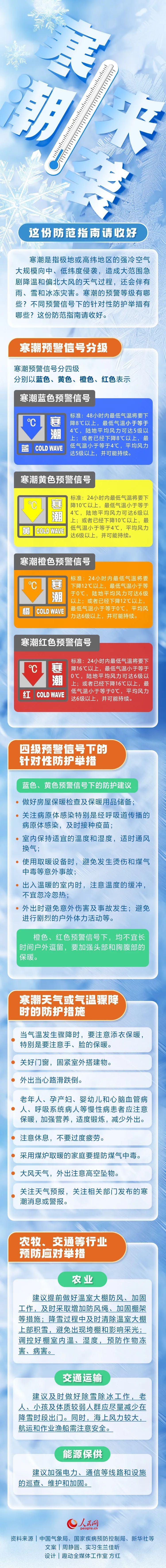 20日起,2024年首场寒潮天气强势来袭,受其影响,中东部地区将出现大范围大风降温和雨雪天气。预计,20日至23日,内蒙古大部、东北地区中南部、西北地区东部、华北西部和北部、黄淮东部和南部、江淮、江汉东部和西南部、江南、华南、西南地区东部等地将降温8~12℃,其中,内蒙古中部和河套地区、山西北部、河北西北部、吉林东南部、辽宁东部、江西南部、浙江南部、福建中西部、广西、广东等地部分地区降温14~16℃,局地可超过18℃。23日最低气温0℃线将南压到广西北部和广东北部。我国中东部大部地区自北向南将先后有4~5级风,东部和南部海区将先后有6~8级风。