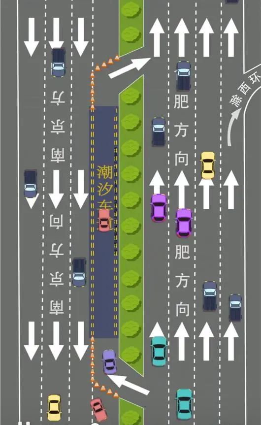然而,“潮汐车道”的使用必须有几个先决条件。首先,车流量要超过设计通行能力;其次,潮汐现象需十分明显:此外,被借道一侧通行能力不受大的影响;最后,中分带具备开口条件。基于以上几点考虑,最终选取合宁高速K521+480-K525+930近4.5公里路段作为试点路段。春运期间,“潮汐车道”将采取动态开启模式,出入口单向车流量日均超6万将启动。