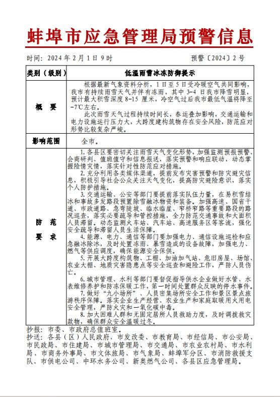 蚌埠发布客户端讯 市应急管理局发布预警信息,根据最新气象资料分析,1日至 5日受冷暖空气共同影响, 我市有持续雨雪天气并伴有冻雨,其中 3-4 日我市降雪明显, 预计最大积雪深度 8-15 厘米,冷空气过后我市最低气温将降至 -7°C左右。