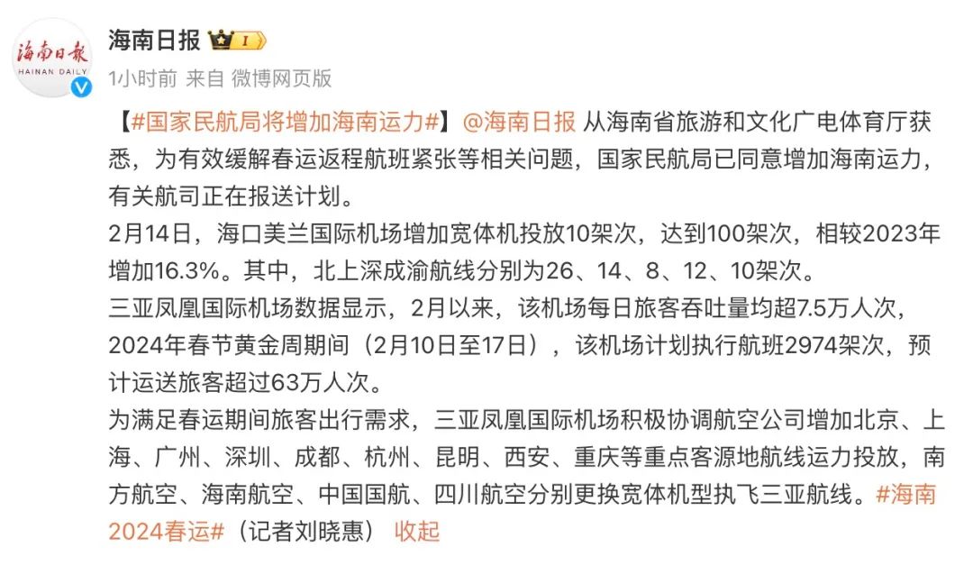 海南省旅游和文化广电体育厅消息,为有效缓解春运返程航班紧张等相关问题,中国民用航空局已同意增加海南运力,有关航司正在报送计划。