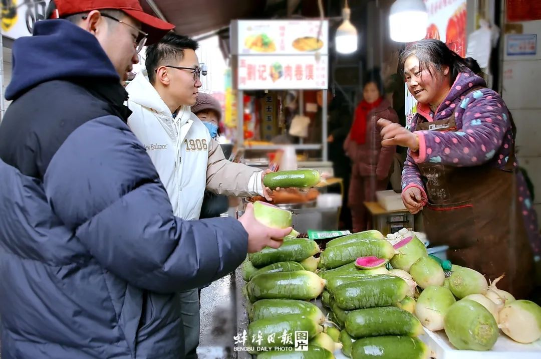 蚌埠的小吃街上,萝卜摊前很是热闹,来往的市民认真挑选着,摊主热情地介绍着,“俺家萝卜你放心买,又甜水分还大。不信,我切一块你们尝尝”……