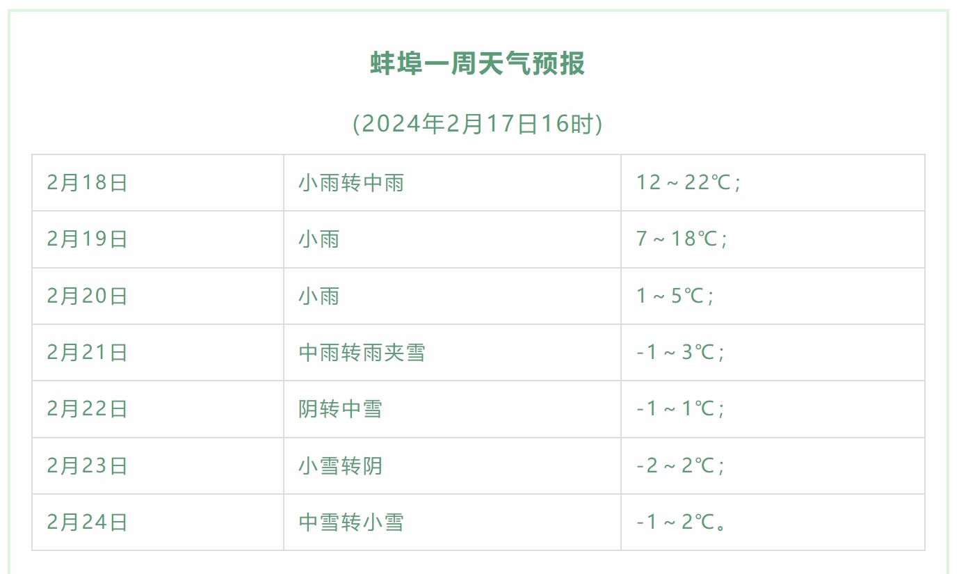 蚌埠发布客户端讯 (融媒体记者 陈瑶)春节假期,天气总体不错,晴好居多,气温也连蹦带跳升到20℃+。假期结束,和大家一起返岗的还有超长的雨雪。