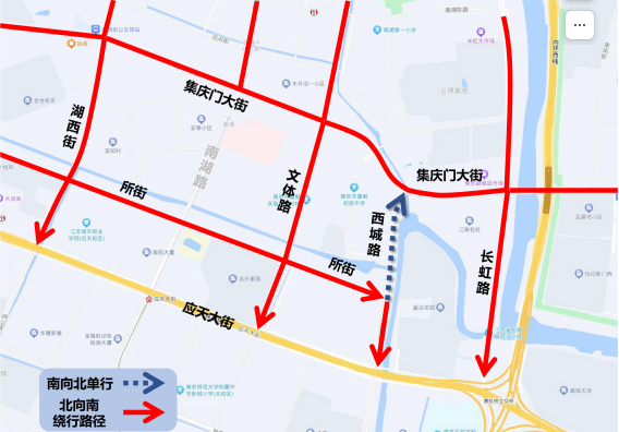 因江心洲污水收集系统二通道建设工程施工需要,自2024年3月8日起至2024年11月8日止,西城路(所街-集庆门大街段)实行机动车南向北单行(内部车辆除外)。