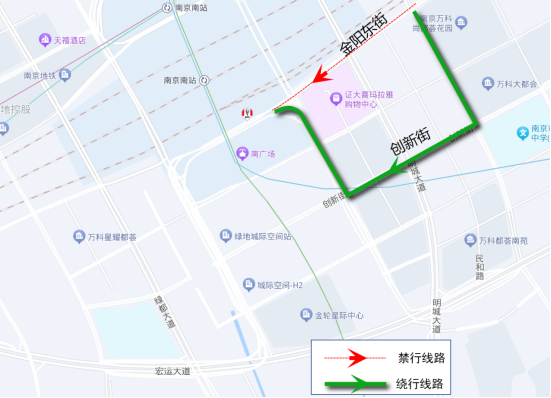 该方向交通可由创新街绕行至六朝路上南落客平台。