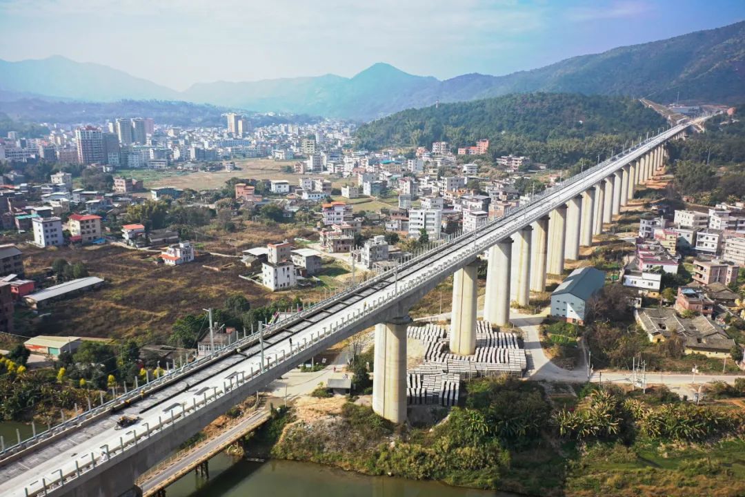 3月17日随着第一对500米长钢轨铺设在无砟道床上新建梅州至龙川高速铁路(简称梅龙高铁)正式进入全线铺轨阶段