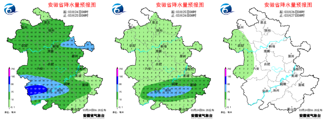 24-26日全省逐日降水量预报未来十天全省具体预报24日(周日):全省阴天有小到中等阵雨或雷雨,其中江淮之间东部、大别山区和沿江江南西部部分地区大雨到暴雨。25日(周一):大别山区和沿江江南阴天有小到中等阵雨或雷雨,部分地区大雨;其他地区阴天转多云有小雨并渐止。26日(周二):江北多云有时阴天,西部部分地区有小雨;江南多云。27日(周三):淮北地区北部多云到阴天;淮北地区南部和淮河以南阴天有小雨,其中大别山区和江南南部部分地区中雨。28日(周四):江北多云到晴天;江南多云到阴天,南部局部有小雨。29日(周五):江北多云到晴天;江南多云到阴天。30日(周六):江北多云;江南多云到阴天,南部局部有阵雨或雷雨。31日至4月2日(周日至周二):江北多云;江南多云到阴天,部分地区有小雨。未来一周城市天气预报