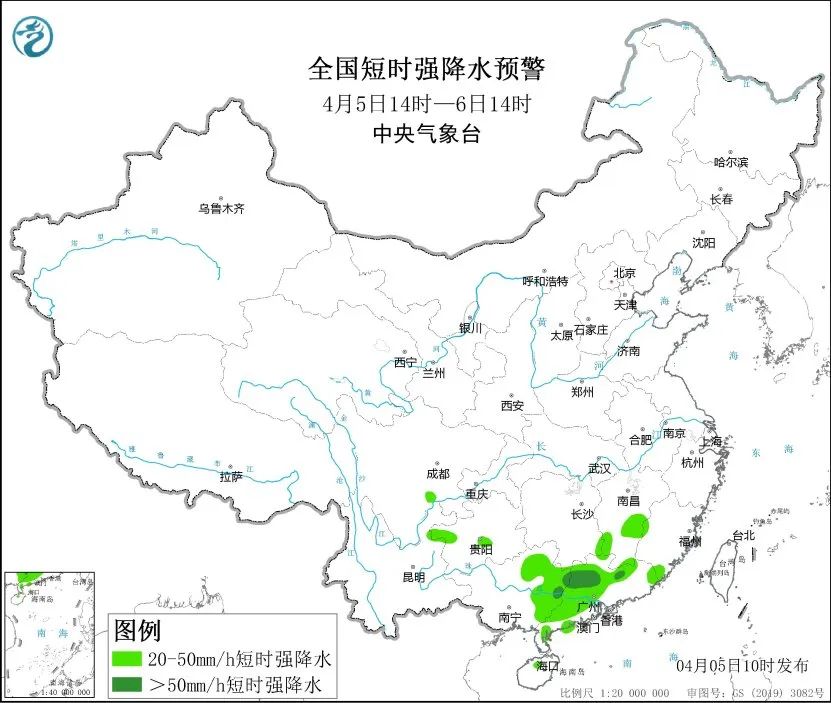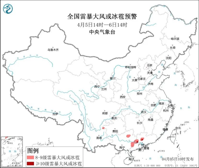 预计4月5日14时至6日14时,广西东部、广东北部等地的部分地区将有8级以上雷暴大风或冰雹天气,局地有10级以上雷暴大风;另外,江西南部、福建西部和东南部、贵州西北部和中部、广西东部、广东中西部和北部等地的部分地区将有小时雨量大于20毫米的短时强降水天气;其中,广西东部和广东中北部等地的局地最大小时雨量大于50毫米,个别地方可达80毫米以上。预计,风雹天气的主要影响时段为今天午后至夜间。