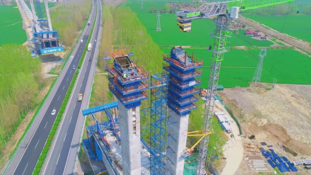 4月9日,在淮宿蚌城际铁路跨京台高速特大桥施工现场,随着最后一方混凝土泵送完成,淮宿蚌铁路跨京台高速特大桥首个主塔完成封顶,项目建设按下“快进键”。