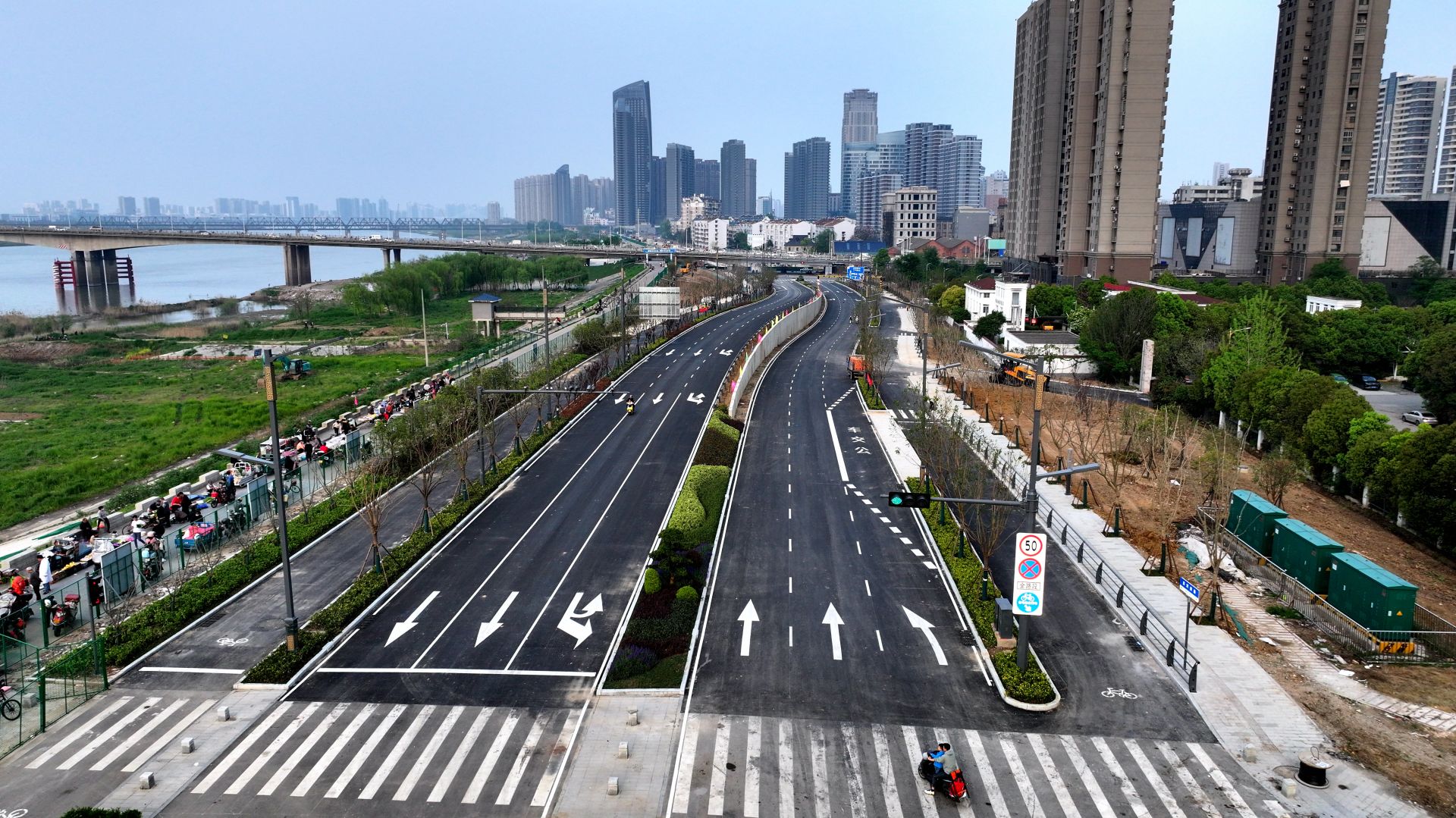 4月12日,蚌报融媒体记者来到滨河南路三期工程现场,沿着建成的纬四路至朝阳路淮河公路桥下段向东探访,一路上看到沥青混凝土路面已施划了交通标线,路中央及道路两侧的绿化隔离带也种植完毕,不时有市民步行经过。随后,记者又来到建设中的朝阳路淮河公路桥下至升平街段,看到十余台工程机械车辆正在往返作业,工人在加紧对沿线配套设施进行安装,一派冲刺节点的繁忙施工景象。
