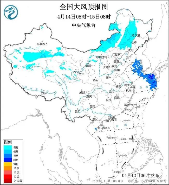 中央气象台4月13日06时继续发布大风蓝色预警: