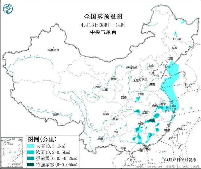 预计,4月13日早晨至上午,黄海北部、中西部和西南部海域、东海西北部海域、杭州湾附近海域、长江口附近海域、舟山群岛附近海域、辽东半岛东部沿岸海域、山东半岛南部沿岸海域、江苏沿岸海域、浙江东北部沿岸海域将有能见度不足1公里的大雾。此外,合肥东南部、浙江北部、上海、河南中部、湖北中部、湖南南部、江西中部、广东北部等地的部分地区有大雾,局地有能见度不足200米的强浓雾。