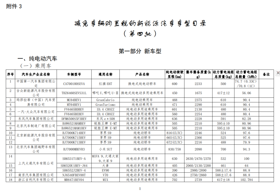 其中,在《减免车辆购置税的新能源汽车车型目录》(第四批)中,小米SU7、比亚迪海豹、智界S7等在列。