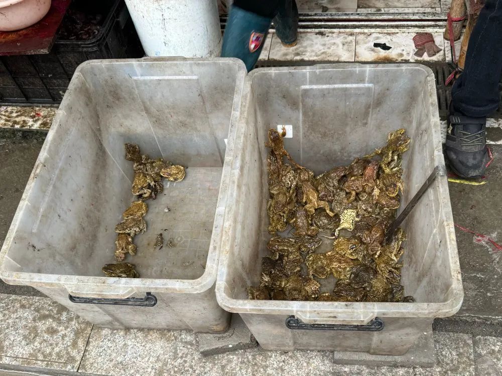 日前,记者早上9点多来到浙沪交界处的某乡镇菜市场。在这条短短200米的菜市街上,卖中华蟾蜍就像卖猪肉一样平常;每走几步路,就能看到一个公开售卖的摊位。