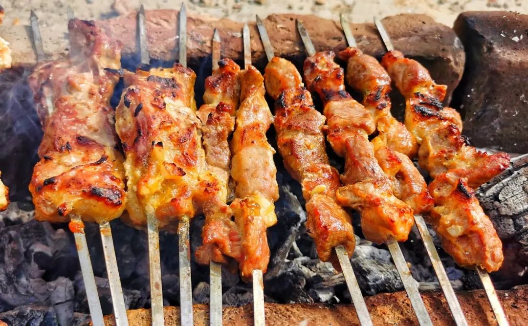 切块的羊肉肥瘦搭配穿在签上被烤制金黄,外焦里嫩的烤肉,还冒着孜然香气,拿着沉甸甸的肉串,每一口吃起来都非常过瘾。
