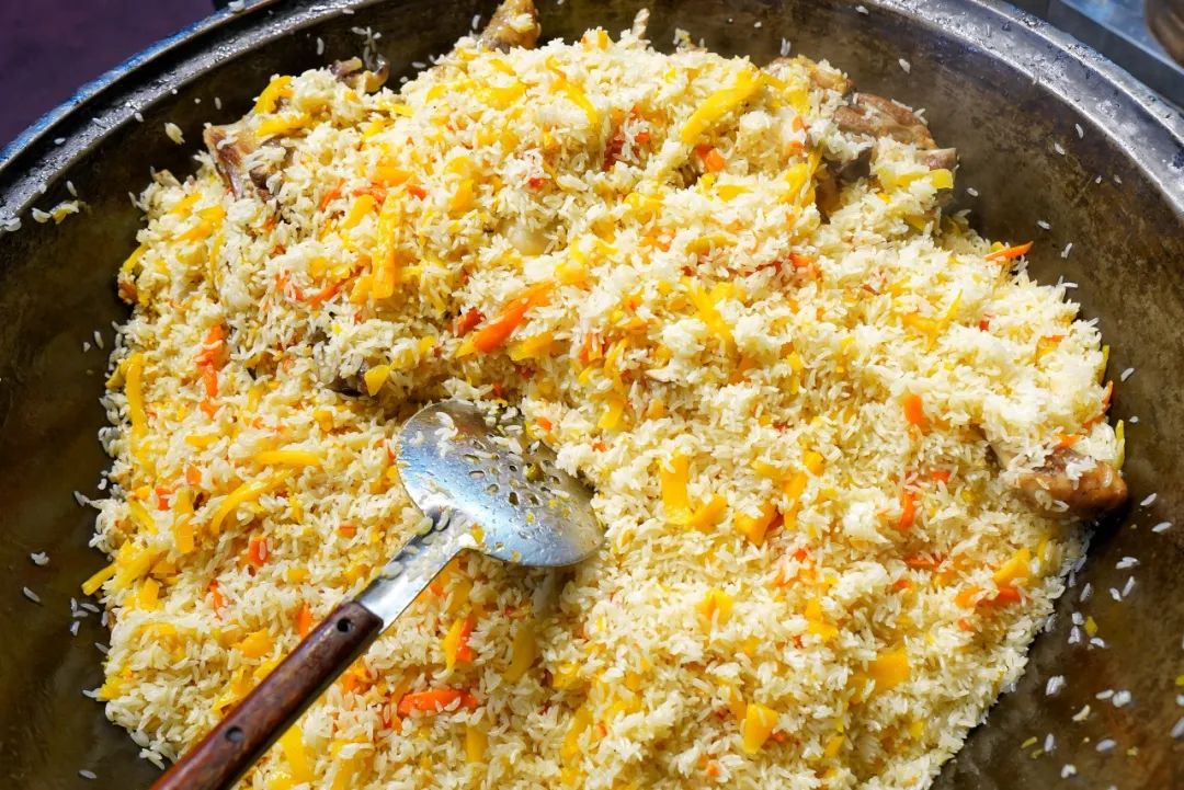 抓饭是阿勒泰家家户户都会做的一道美食,将葡萄干、杏干、胡萝卜、羊肉等与香糯的米焖煮,色、香、味俱全。