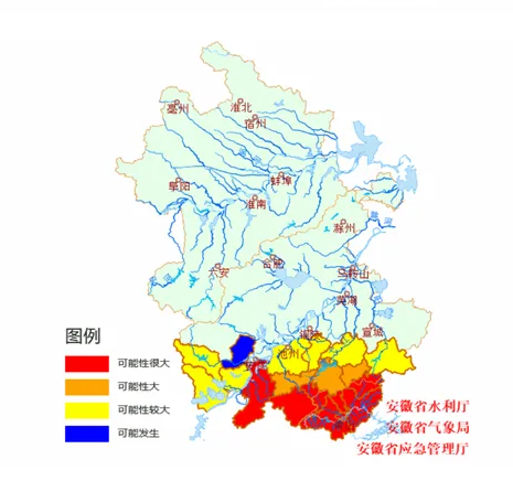 6月26日16时,安徽省气象局和安徽省自然资源厅联合发布地质灾害气象预警。随后,安徽省水利厅、安徽省气象局、安徽省应急管理厅又联合发布山洪灾害气象预警。