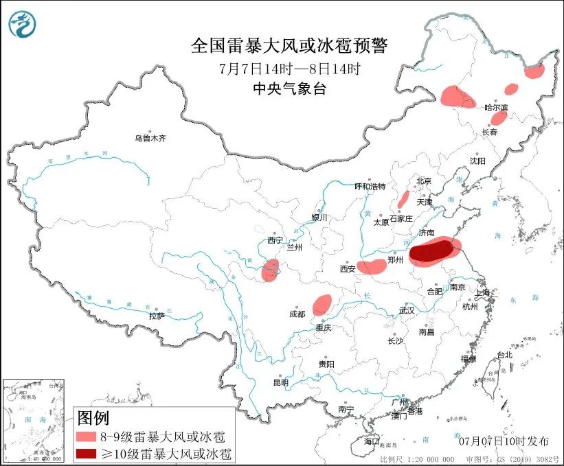 中央气象台7月7日10时继续发布强对流天气蓝色预警。预计7月7日14时至8日14时,内蒙古、黑龙江、吉林、青海、河北、山东、河南、安徽、江苏、四川等地部分地区将有8级以上雷暴大风或冰雹天气。其中,山东南部、河南东部、安徽北部、江苏北部等地的部分地区将有10级以上雷暴大风,最大风力可达11级以上,局地有可能出现龙卷。