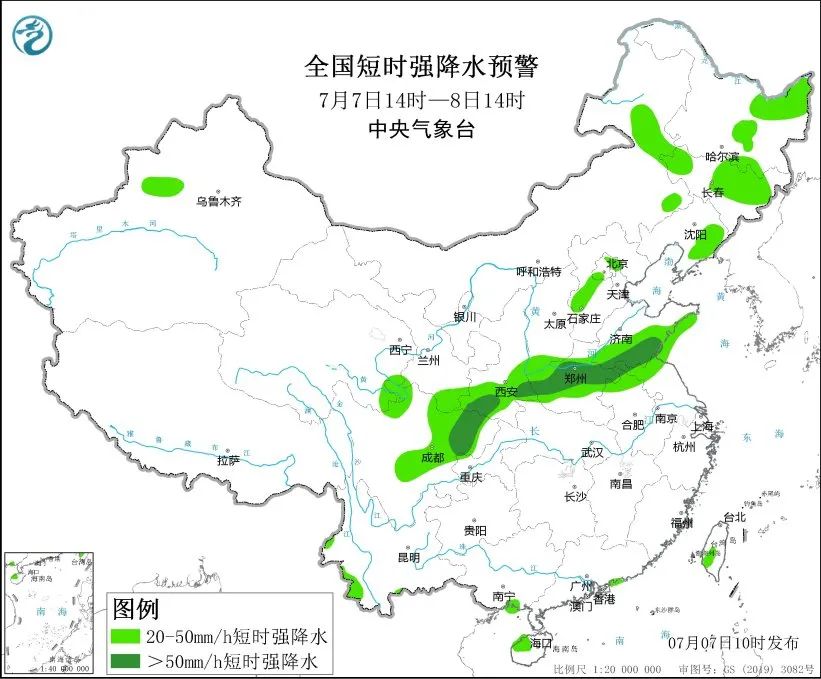 内蒙古、黑龙江、吉林、青海、甘肃、陕西、河北、北京、山东、河南、安徽、江苏、四川、云南、海南岛等地的部分地区将有小时雨量大于20毫米的短时强降水天气。其中,陕西南部、山东南部、河南中西部和东部、安徽北部、江苏北部、四川北部等地的部分地区小时雨量大于50毫米,最大可达80毫米以上。