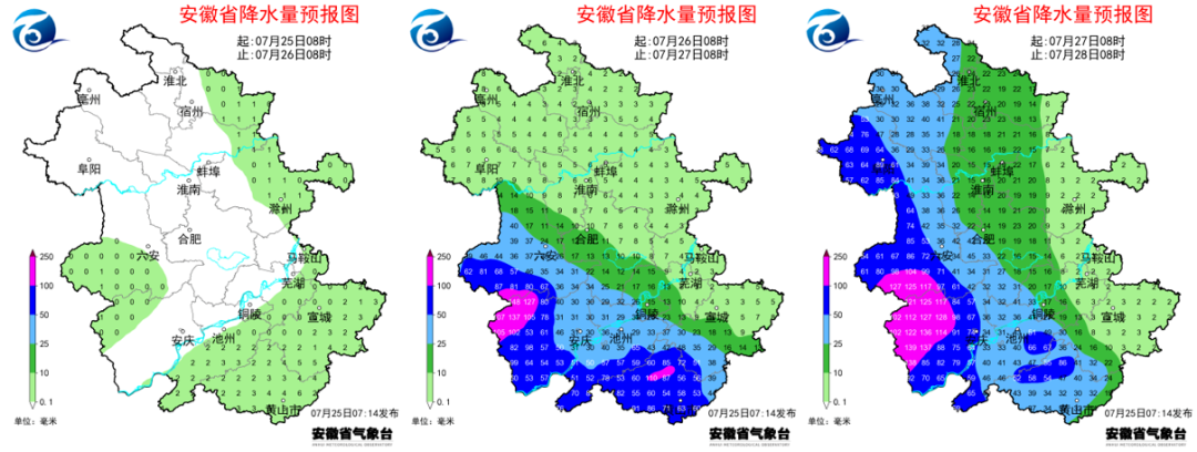 未来三天累计雨量:安徽省西部50~100毫米,其中大别山区和江南西部100~150毫米,局部超过250毫米。