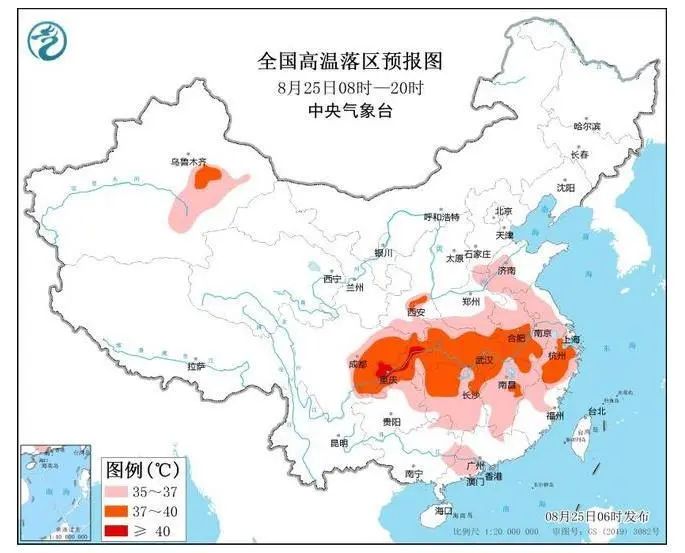 预计8月25日白天,新疆南疆盆地、陕西中南部、山东南部、河南东部和南部、安徽、江苏大部、上海、湖北、湖南、江西、浙江、福建北部、四川盆地、重庆、贵州北部、广西东部、广东中部和西部等地有35℃以上高温天气,其中,新疆吐鲁番盆地、陕西南部、安徽中南部、湖北大部、湖南中部和北部、江西东北部、浙江中部、四川盆地中东部、重庆大部等地部分地区最高气温37~39℃,局地可达40℃以上。