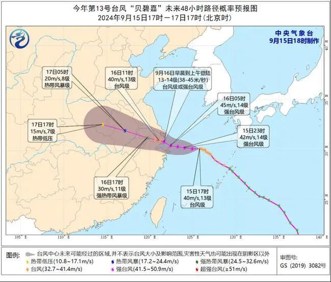 大风预报:9月15日20时至16日20时,黄海南部、东海大部、浙江北部、上海、江苏南部、安徽东部将有6~8级、阵风9-10级的大风,其中东海北部、上海东部及其沿海、江苏东南部及其沿海、浙江东北部及其沿海、杭州湾、长江口区、舟山群岛附近海域将有9~11级、阵风12~13级的大风,“贝碧嘉”中心经过的附近海域或地区风力可达12~14级、阵风15~16级。
