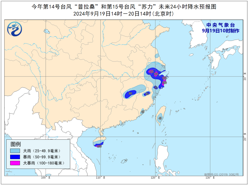 降水预报:9月19日14时至20日14时,安徽东南部、江苏南部、上海、浙江大部、江西中北部、福建北部和东部等地部分地区有大到暴雨,其中,浙江北部和东部、安徽东南部等地部分地区有大暴雨(100-180毫米)。