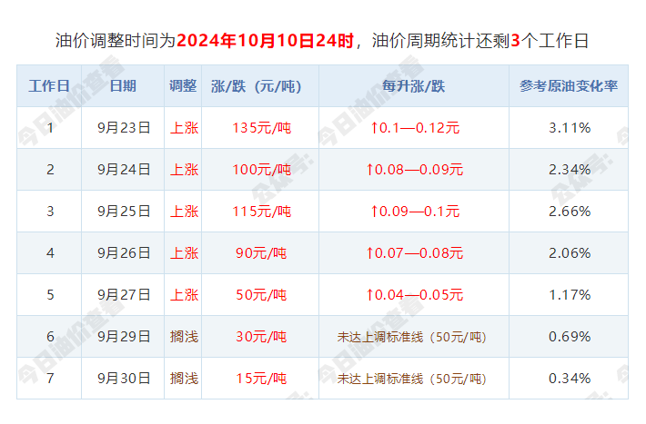 10月5日,国内油市休市,当前预计油价上涨15元/吨,未达50元/吨的上调标准线,处于搁浅状态。近日国际原油价格连续两天上涨,受此影响,10月8日(国庆假期过后第一个工作日)油价周期统计第8个工作日,油价涨幅将扩大,10月10日晚12点油价调整,油价恐怕要涨!