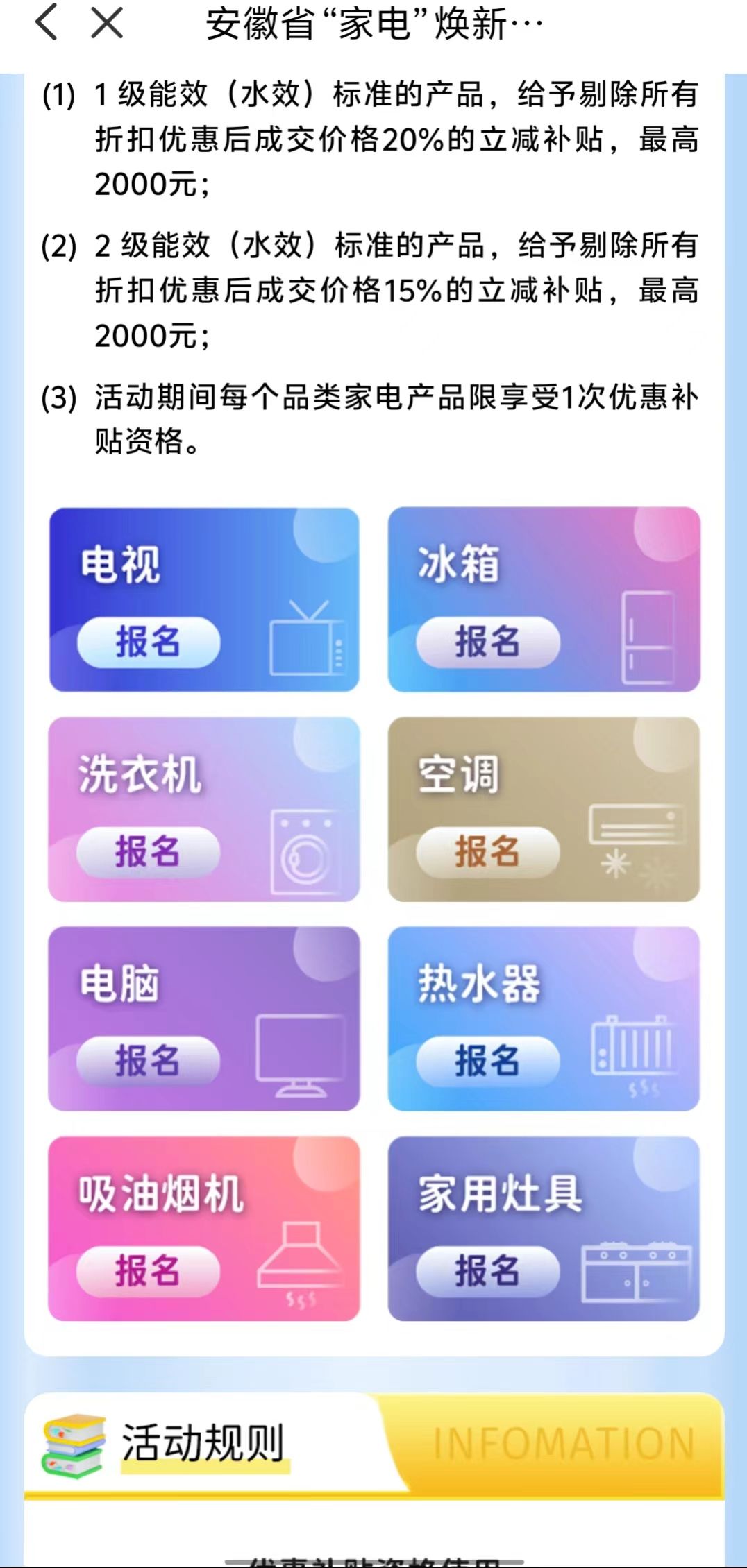 每个品类家电产品在全国范围内限1次优惠补贴。(如已使用某品类1级能效优惠补贴资格,该品类2级能效优惠补贴资格不能使用)。