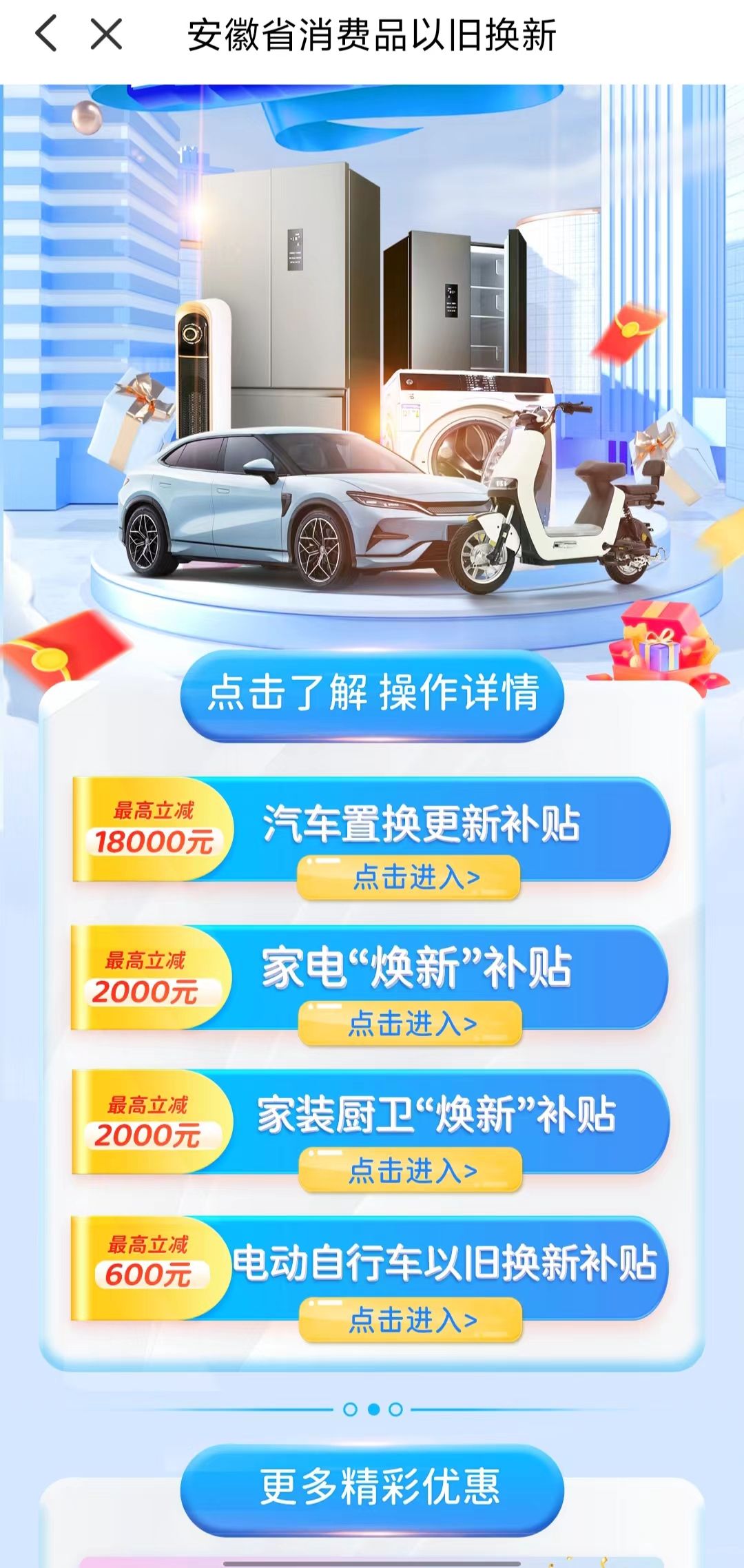 在首页找到“政府补贴”,点击进入“全国政府补贴专区”,选择“安徽省消费品以旧换新”进入。然后在“汽车置换更新补贴”“家电‘焕新’补贴”“家装厨卫‘焕新’补贴”“电动自行车以旧换新补贴”中选择自己需要申请的栏目进入。