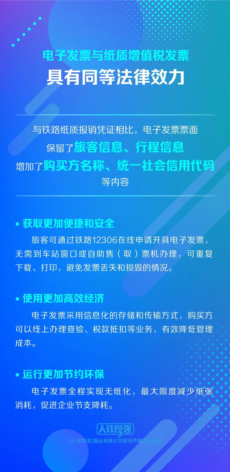 电子发票是铁路运输企业提供境内旅客运输服务后,按照税务机关规定以数据电文形式向服务购买方(可为个人或企事业单位)开具的收付款报销凭证,与纸质增值税发票具有同等法律效力。与铁路纸质报销凭证相比,电子发票的票面保留了旅客信息、行程信息,增加了购买方名称、统一社会信用代码等内容;获取更加便捷和安全,旅客可通过铁路12306在线申请开具电子发票,无需到车站窗口或自助售(取)票机办理,可重复下载、打印,避免发票丢失和损毁的情况;使用更加高效经济,电子发票采用信息化的存储和传输方式,购买方可以线上办理查验、税款抵扣等业务,有效降低管理成本;运行更加节约环保,电子发票全程实现无纸化,最大限度减少纸张消耗,促进企业节支降耗。